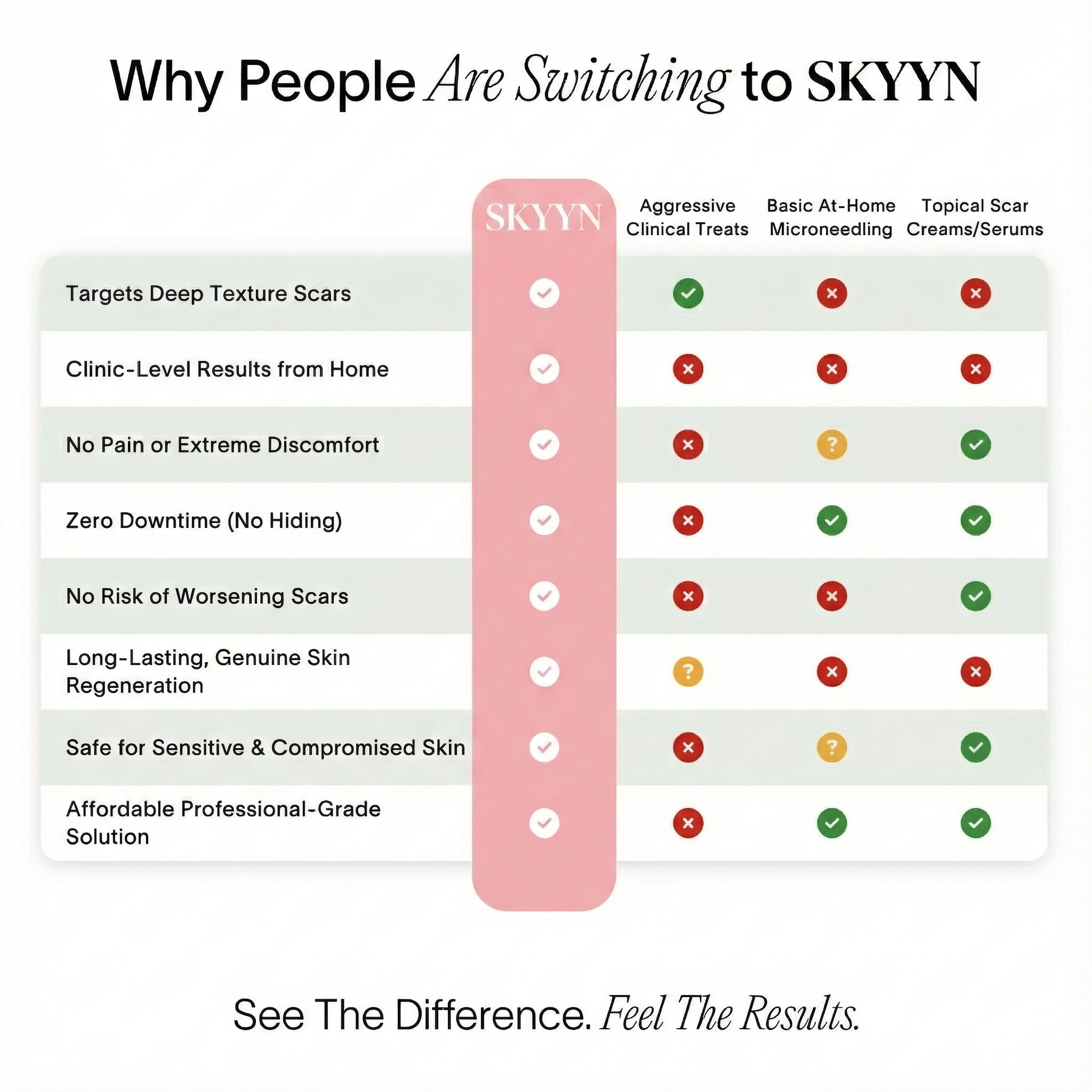 Most scar treatments are either too aggressive (like lasers) or too superficial (like gels). Derm combines the precision of microneedling with a targeted repair serum, giving you the power of a clinic-grade treatment — at home, without pain or recovery time.