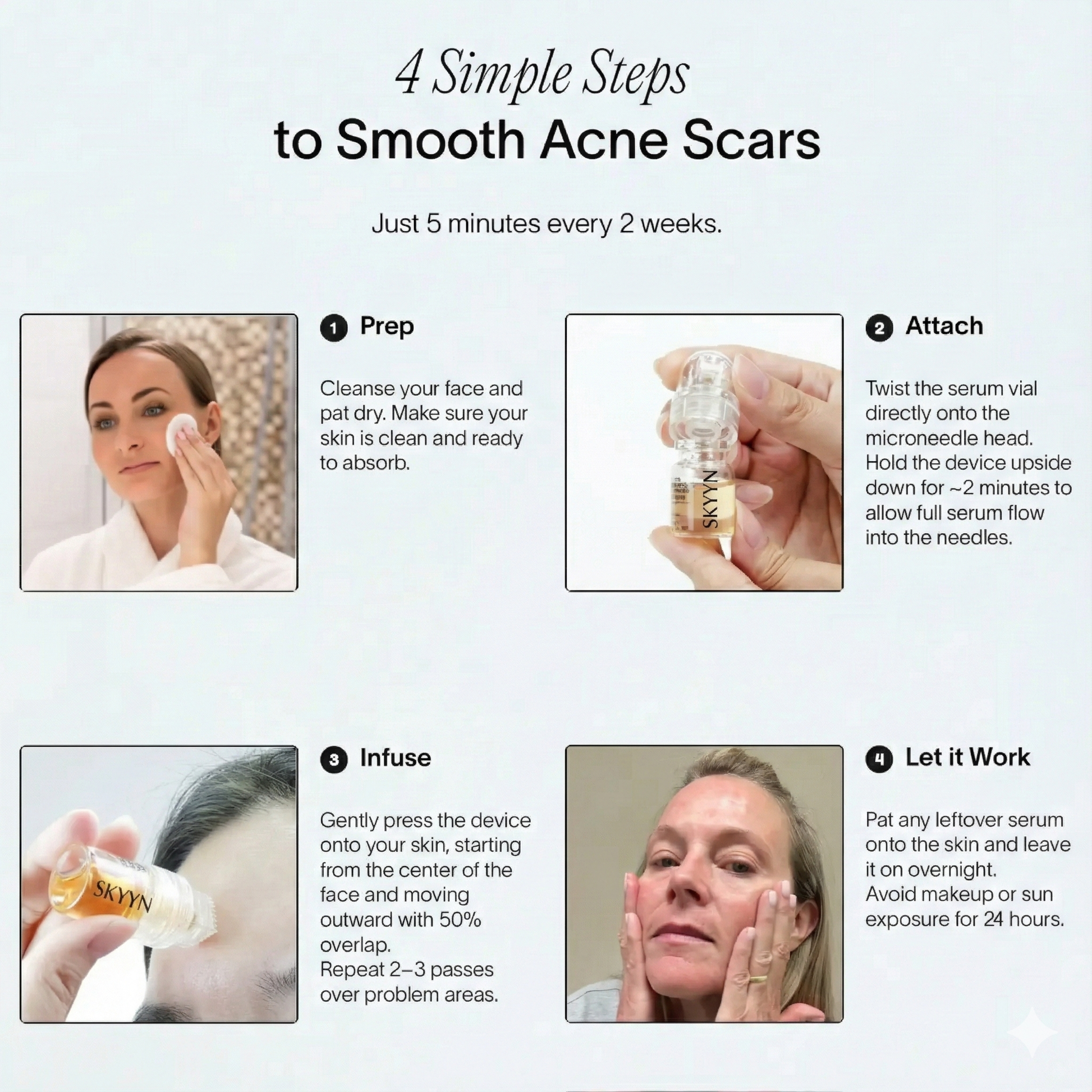 This depth allows the serum to reach the upper dermis, where acne scars form, without causing pain or requiring medical supervision.